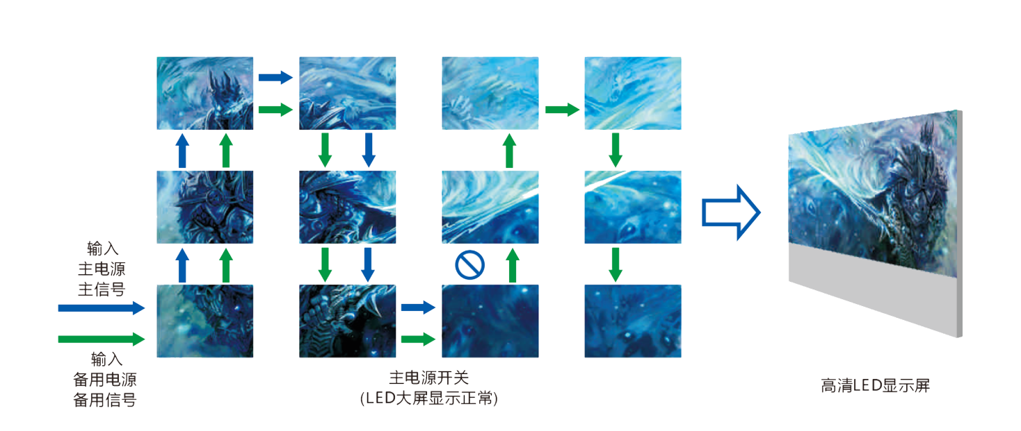 發(fā)生故障的時(shí)候,另一路信號自動(dòng)介入,保證顯示屏正常工作。
